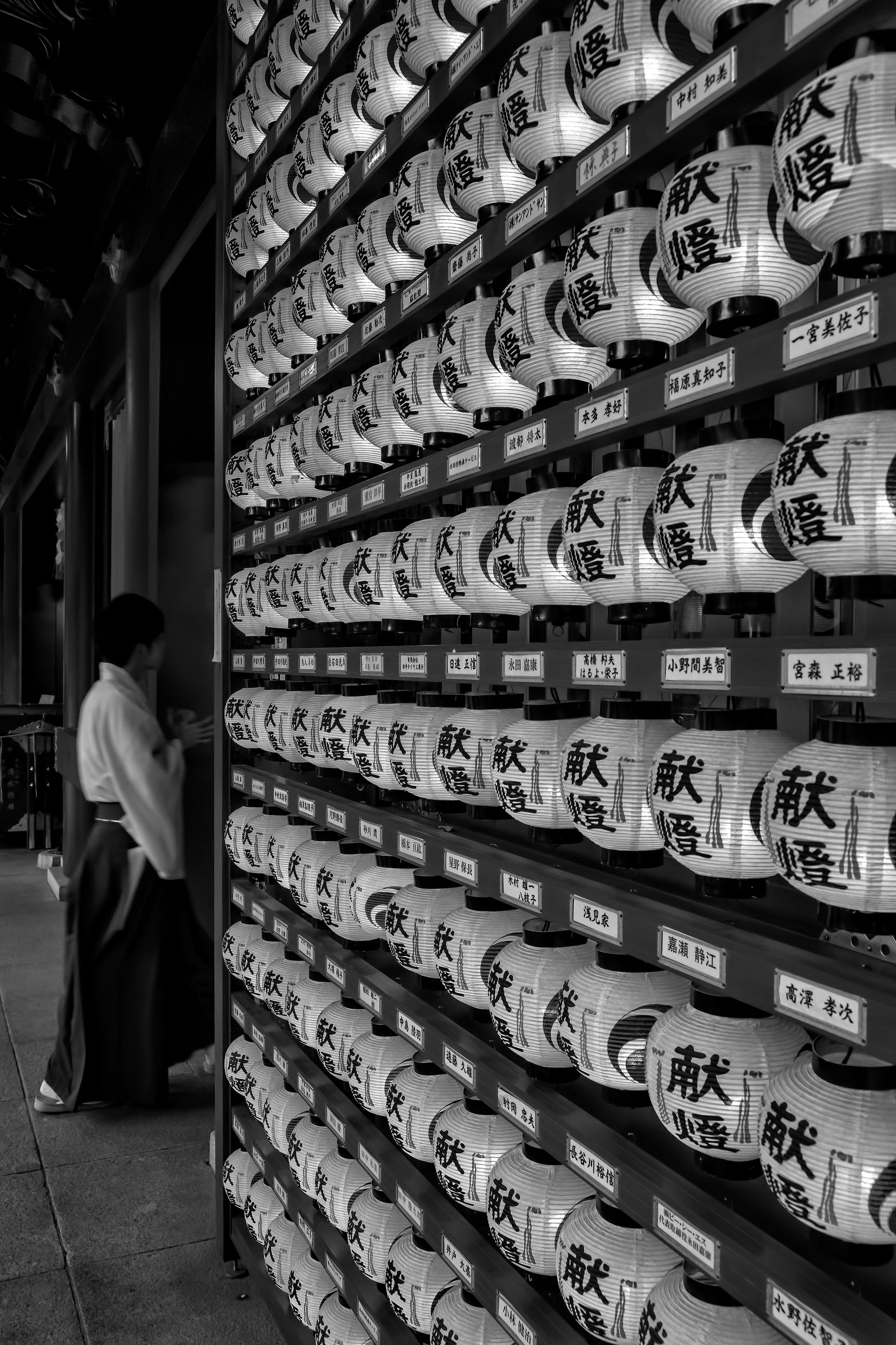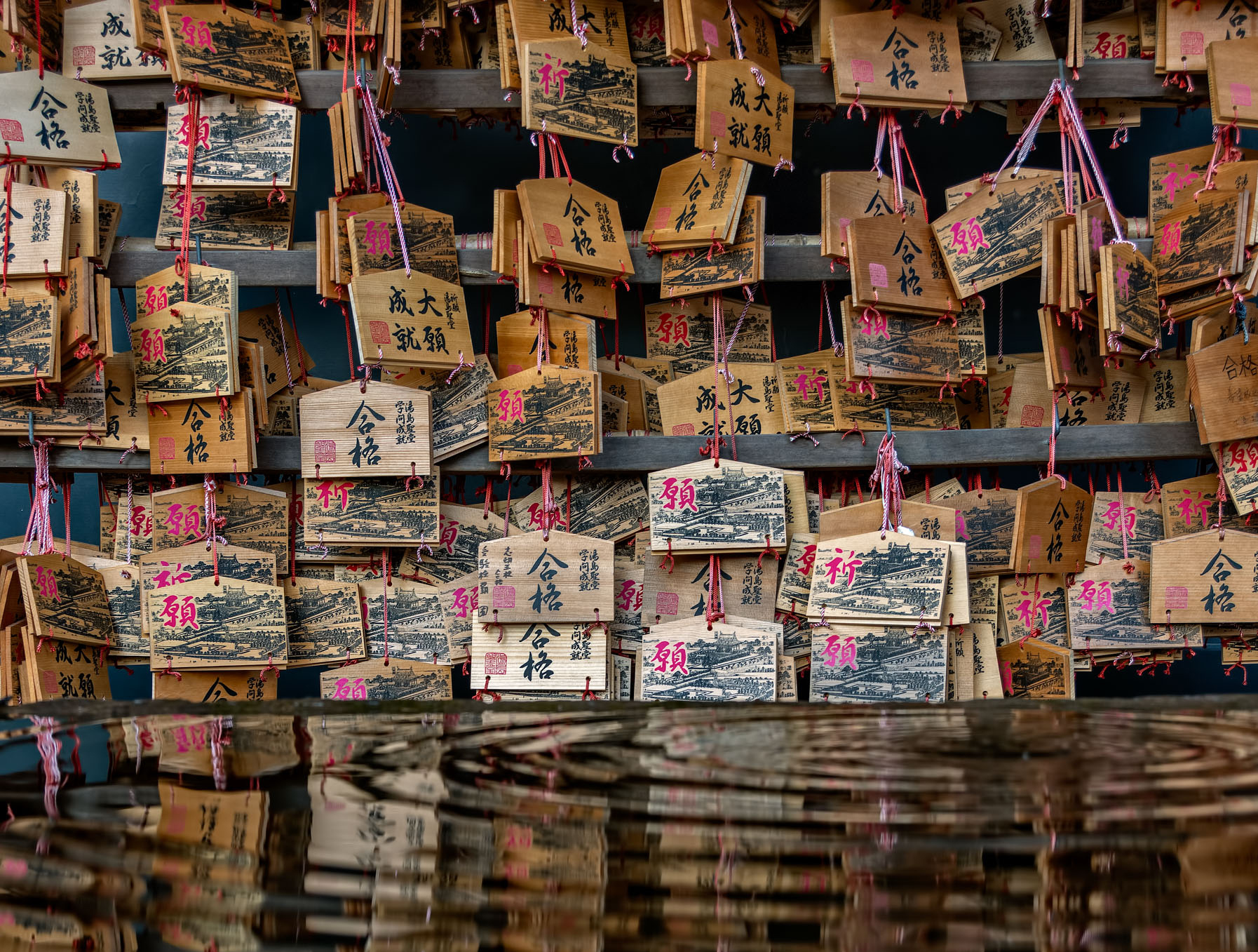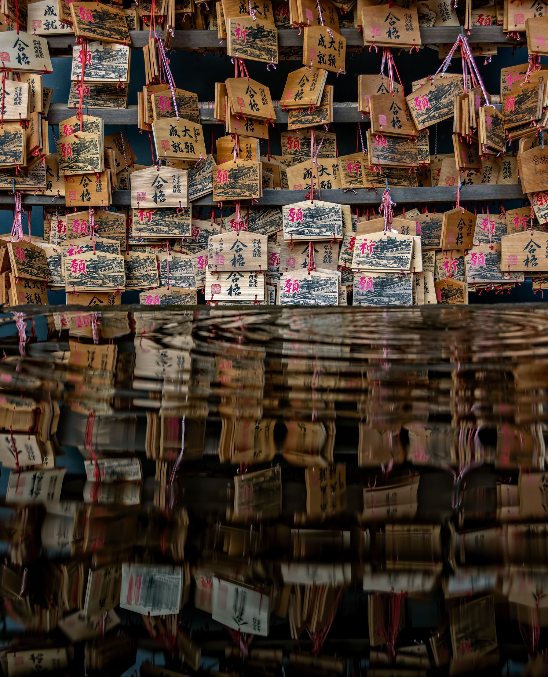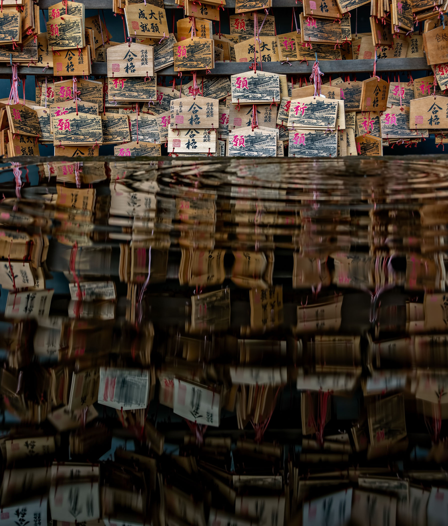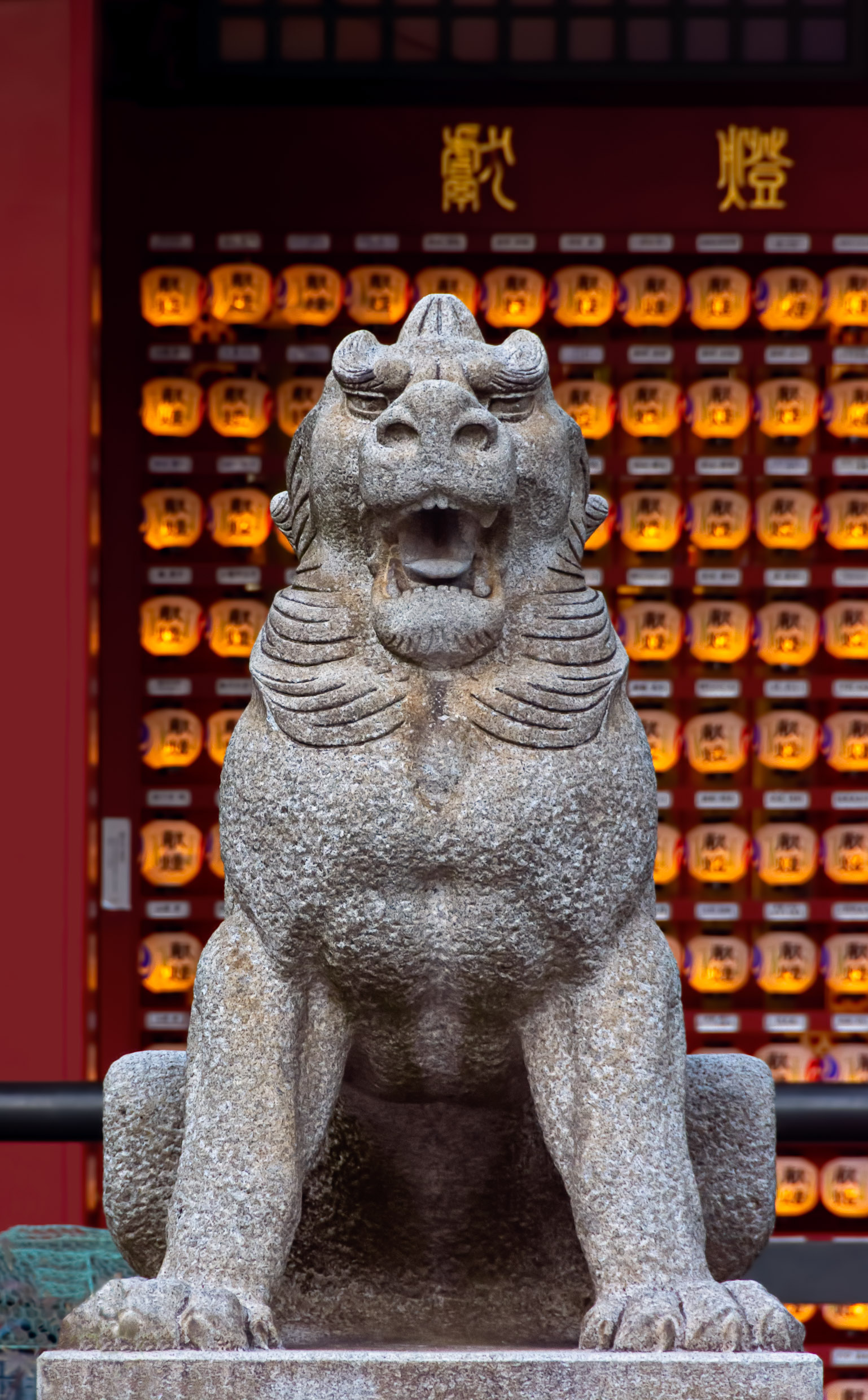 Something else that strikes me is that the degree of imperfection you've allowed in each photo is very important. If you edited out all the small deviations from the pattern, or centered all the off-centre elements, these would be very different photos. Like with the first one (wall of blue windows), if you look at it long enough it seems to tilt to the right because of the uneven pattern; if you 'fixed' that I think it would be a much less interesting shot. With the second one (stone lion), given the central framing I'd expect a third gold character above its head.