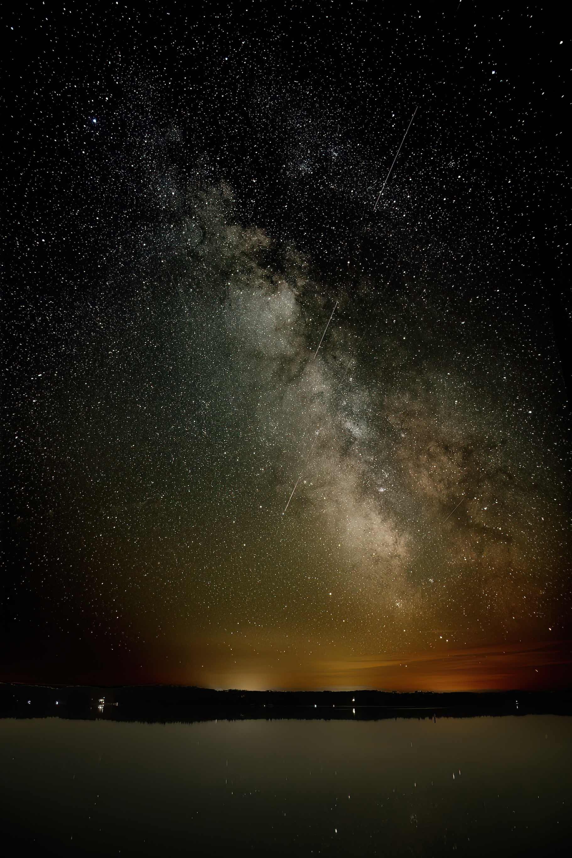 In order to further reduce the yellow light pollution I added a violet color layer, which also took the yellow out of the water color. This , in combination with a vignette, seems to focus more attention on the sky, and also I wasn't sure that the relatively brightly lit, large expanse of water in this setting contributed that much to the image.