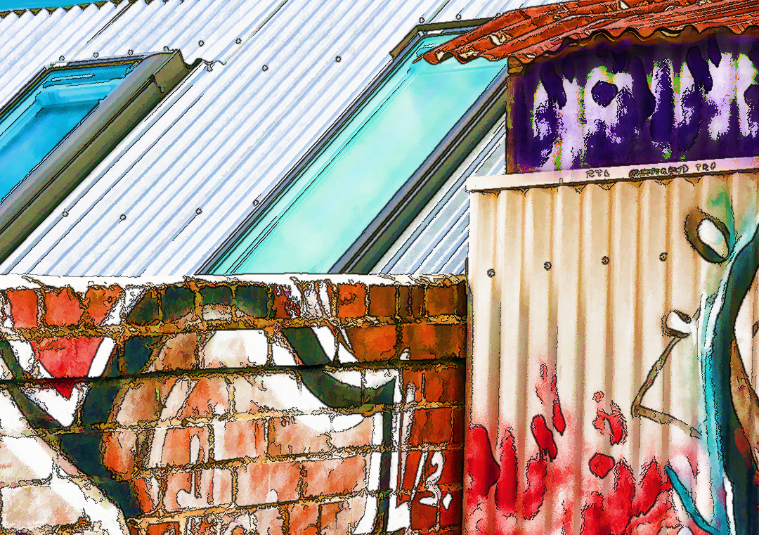 its the dark patch under the reddish corrugated iron roofing on the upper right